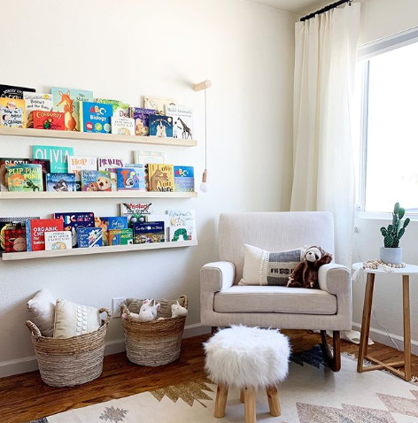 Books - Picture ledges and spice shelves are a quick and easy DIY that can be added to any space for book storage that doesn’t take up a lot of space. Layer the books on the shelves so that your kids can find what they want and leave a stool nearby (if they’re old enough) so they can access items that are on higher shelves.